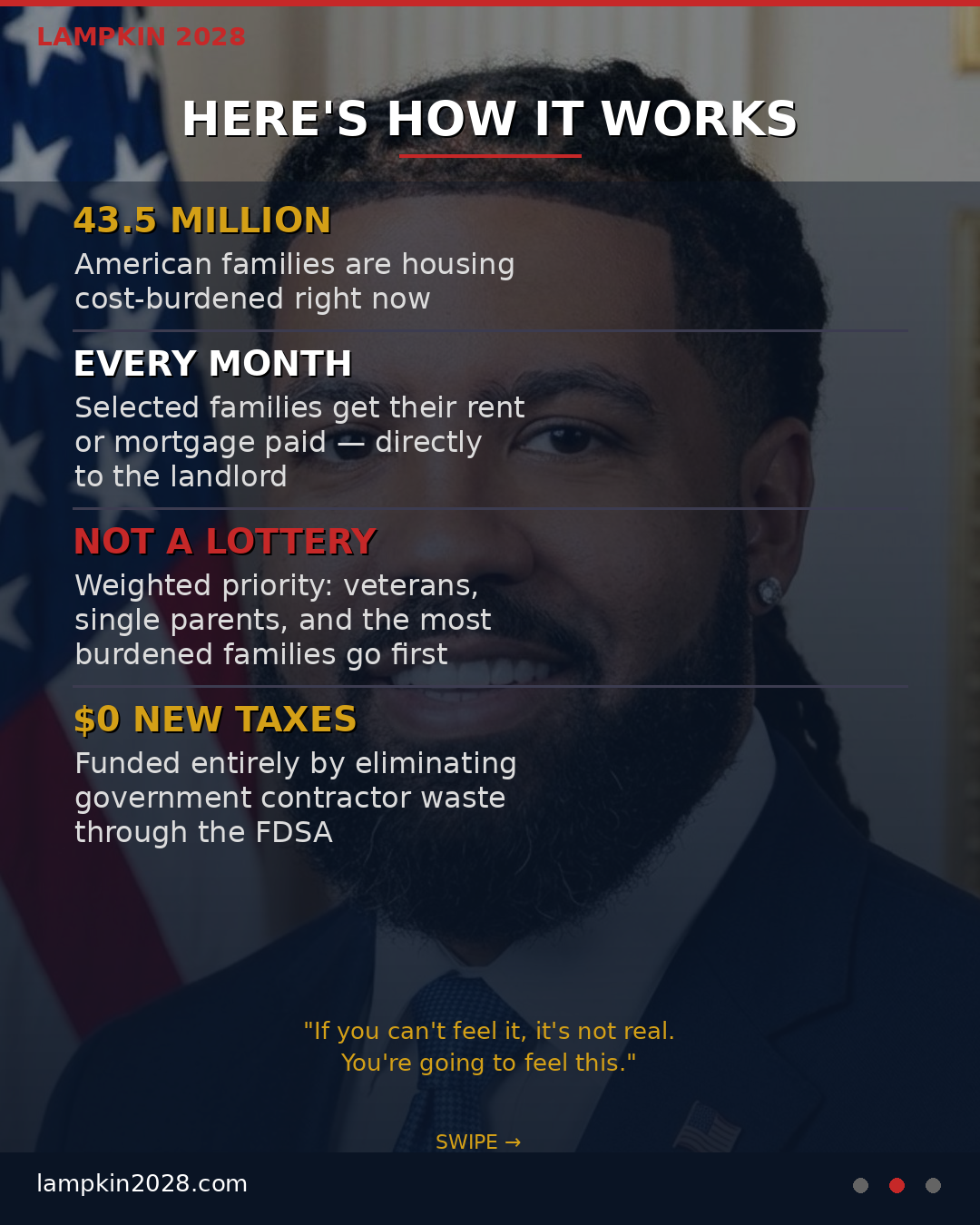 The Lampkin Housing Relief Fund is the flagship program of the American Efficiency Dividend—a governing principle that every dollar saved from government waste gets returned directly to American citizens. The fund pays rent or mortgage directly to landlords and lenders for selected American families who are housing cost-burdened.