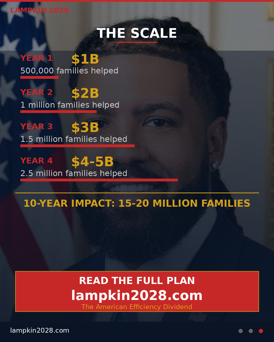 The Lampkin Housing Relief Fund is the most visible example of a broader governing philosophy: the American Efficiency Dividend. Every dollar saved from government waste belongs to the American people—returned in forms they can see, measure, and feel.